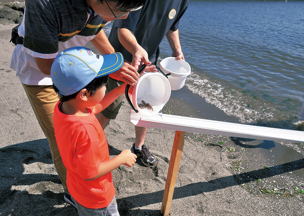 当日は地元のボーイスカウト川崎第56団を含む総勢およそ50人が参加した。普段あまり見る機会のない真鯛の稚魚を目にすると「小さい」「かわいい」などの声が上がった。参加者は、砂浜に設置された装置を利用して「大きくなって帰ってきてね」と願いを込め、約1000匹の稚魚を放流した。