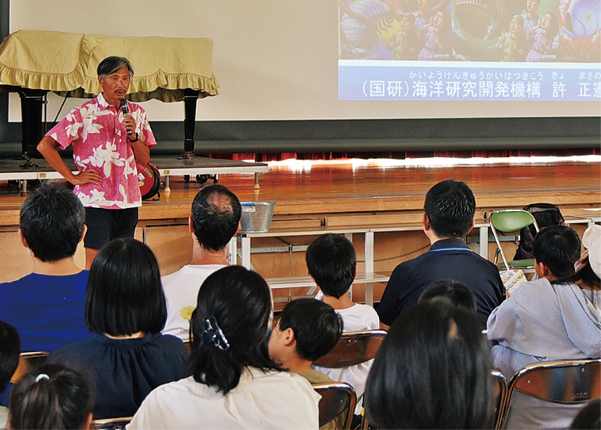 幸区遠藤町の市立御幸小学校体育館で8月26日、海洋研究開発機構(JAMSTEC)研究者の許(きょ)正憲さんによる講演会が行われた。許さんは、訪れた親子連れら約90人を前に、身近な海洋生物や、水深6500メートルまで潜れる有人潜水調査船「しんかい6500」から見た深海の様子などを紹介した。