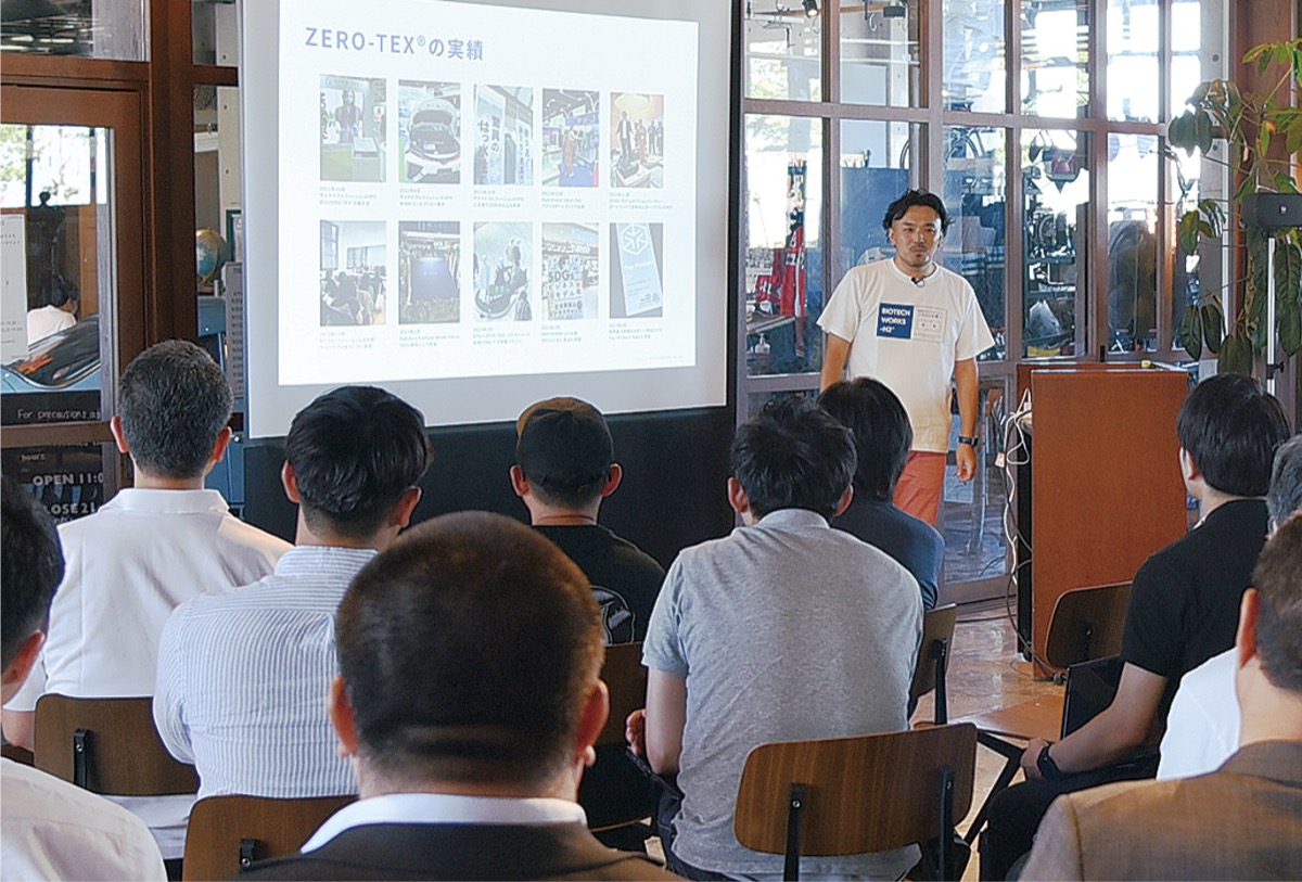 服地の開発・販売を行う(有)やまぎん(東京都渋谷区)が進めるプロジェクト「BIOTECHWORKS―H2(バイオテックワークスエイチツー)」の説明会で、アパレル、医療などの業界から約50人が参加し、耳を傾けた。
