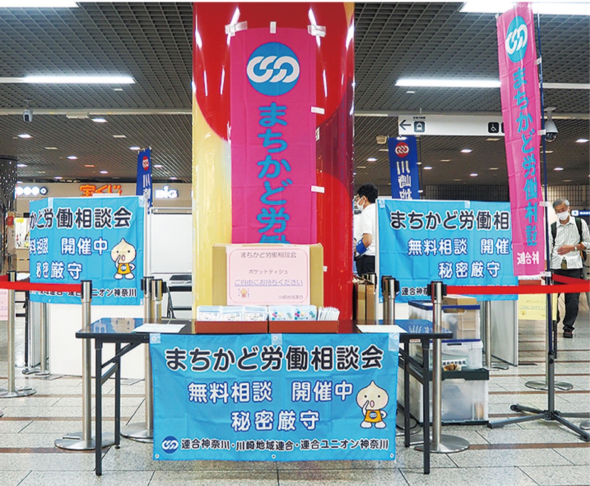 連合神奈川(吉坂義正会長)と川崎地域連合(渡部堅三議長)は9月8日、川崎駅地下街アゼリア東広場・宝くじ売り場前で「まちかど労働相談会」を開催した。