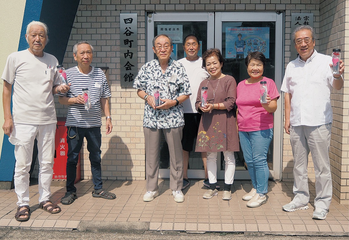 川崎区の四谷町内会(和泉美津男会長)は9月15日、会長、副会長らが集まり860人に配布する敬老の日のお祝い品の準備を行った。