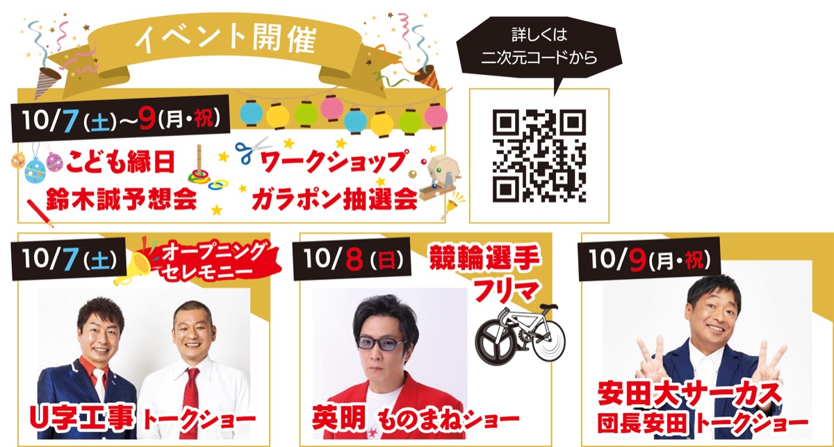 10月7日から9日は1年ぶりの本場を再開し、初日にはオープニングセレモニーを行う。縁日やワークショップ、お笑い芸人によるトークショーも楽しめる。未確定車券1000円で川崎競輪グッズ等があたるガラポン抽選会、現役競輪選手によるトークショーや元選手の予想会なども実施。キッチンカーの出店もある。