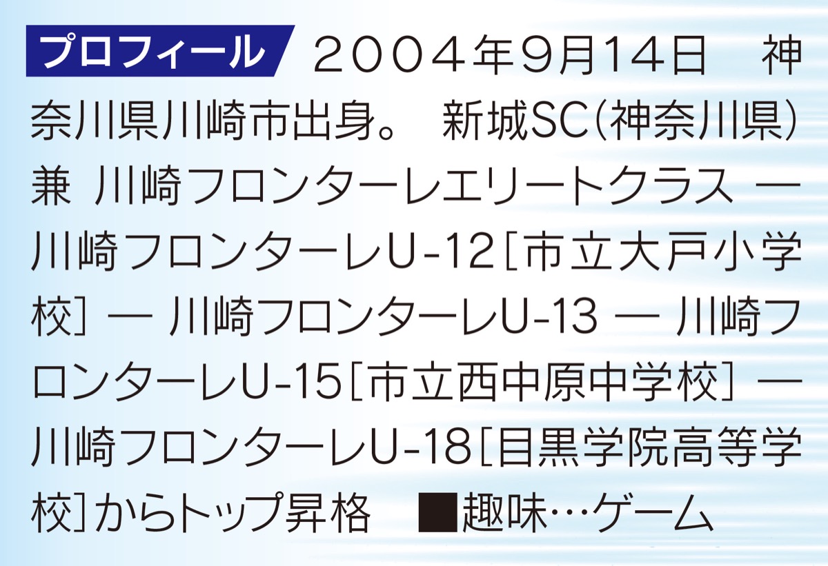 「出られる試合には全部出て、一つでも勝利に貢献できるよう頑張りたい」と貪欲な姿勢をみせる。フロンターレU―18から今季トップチームに昇格。3月の湘南戦でデビューし、ここまでリーグ戦2試合とYBCルヴァン杯1試合に出場。3月8日の清水戦は90分出場。「プレー判断などで課題や悔しさが残ったが、トップチームで通用する自信にもなった」。今年のキャンプではトップ選手とのスピードや強度に、力の差を感じるも「体を寄せるスピードが前よりも速くなった」と手応えを口にする。