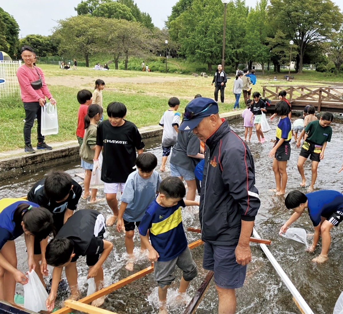 日本空手道「泊親会」川崎道場(佐々木公一代表/本部川崎区大師町)は10月8日、大師公園(川崎区大師公園)でニジマスつかみに挑戦した。園内の水路(カナール)に放たれた約500匹のニジマスを追いかける子どもたちの歓声が響き渡った。