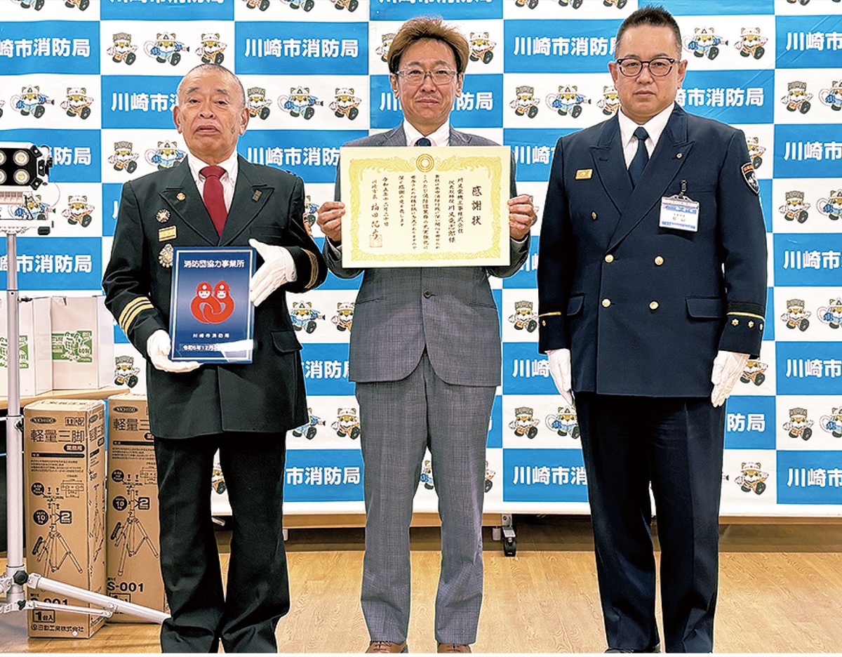 認定を受け同社は、バッテリー式の投光器を臨港消防団に寄贈。式典では杉山哲男臨港消防署長から感謝状が手渡された。投光器は火災現場で原因調査の際などに役に立つという。