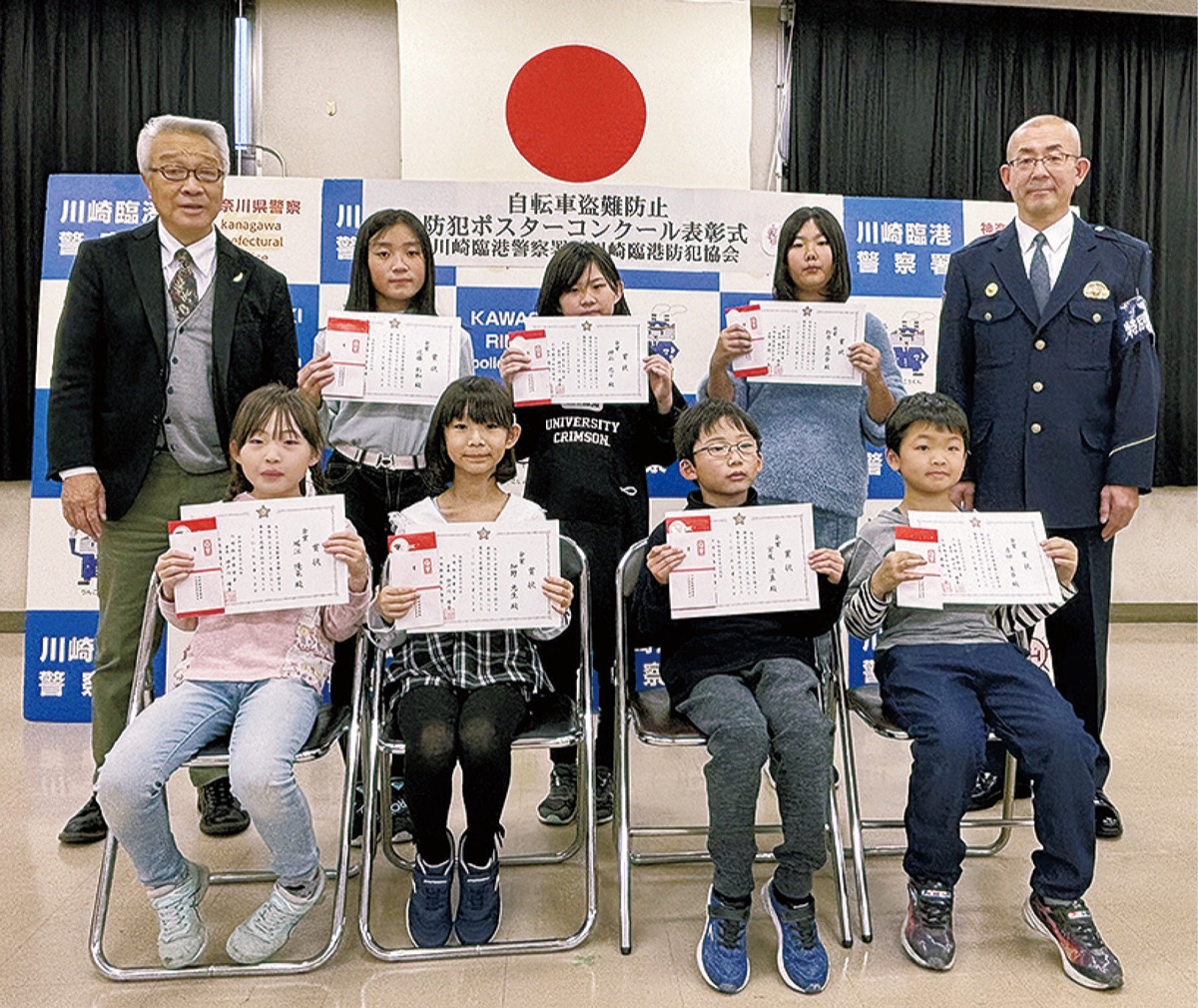 二重ロックなどで自転車の盗難防止を呼び掛ける防犯ポスターコンクールの表彰式が12月19 日、川崎臨港警察署(川崎区池上新町)で開催された。同署と川崎臨港防犯協会が主催。優秀作品の金賞に選ばれた9人のうち7人が出席し、仲戸川博幸署長や浦野一吉防犯協会会長から表彰状が贈られた。