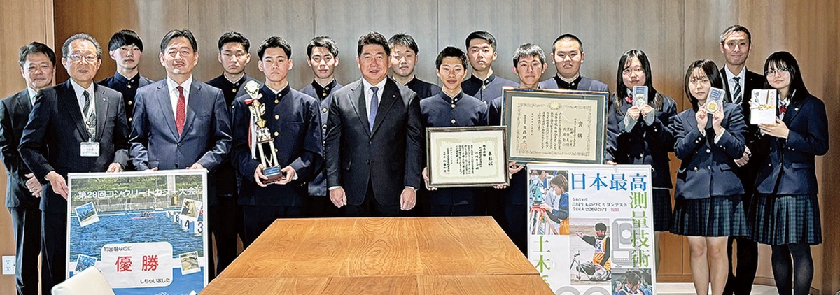 表敬訪問したのは、同校シビルエンジニア部の生徒と濱野雄功校長、同部顧問の佐藤勇輝教諭の12人。大会のうち、昨年8月に東京都江東区の海の森水上競技場で開催された「第28回土木系学科学生によるコンクリートカヌー大会」は土木の主材料であるコンクリートでカヌーを製作し、実際に漕いでタイムなどを競った。22校24チームが参加し、同校が出場した一つ「川崎カープ号」が優勝した。