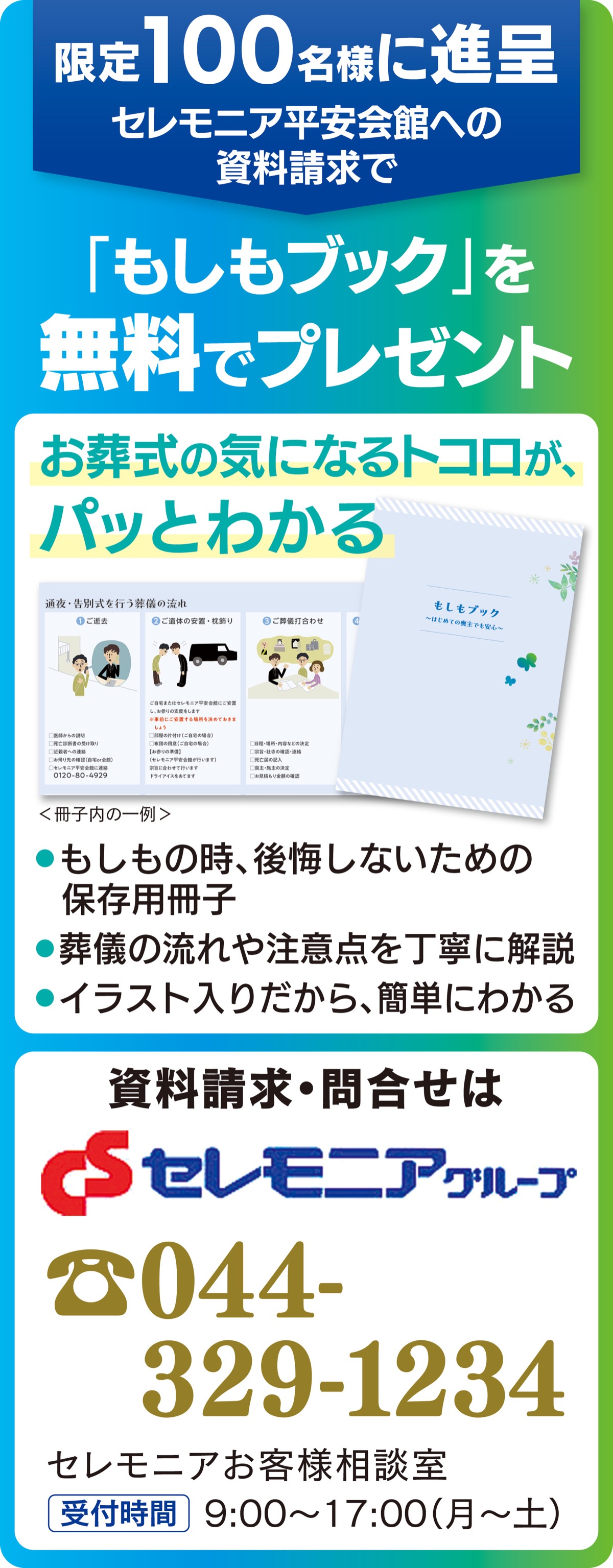 川崎で創業74年、「平安会館さいわい」「家族葬会館もくれん」など全区に式場を展開し、地域に寄り添い「安心」と「信頼」を届けるセレモニアグループでは、保存用冊子『もしもブック』を用意。丁寧な解説とイラスト入りで、ひと目で葬儀の流れや注意点がわかるのがポイント。かさばらないサイズで、家庭での保存用にぴったり。万が一のときにも頼りになる。また「終活の一環として、そろそろ葬儀のことを考えておきたい」という人にもおすすめ。