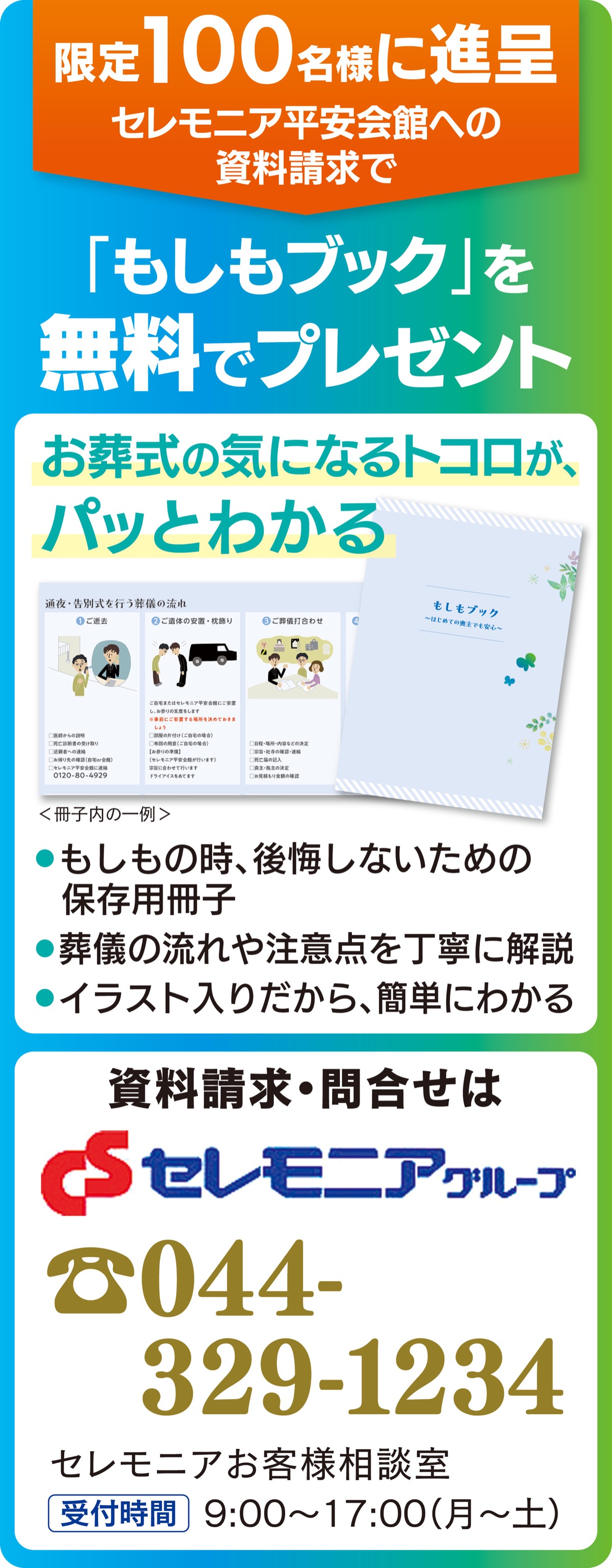 川崎で創業74年、「平安会館かわさき」「平安会館わたりだ」「アクイール塩浜」など全区に式場を展開し、地域に寄り添い「安心」と「信頼」を届けるセレモニアグループでは、保存用冊子『もしもブック』を用意。丁寧な解説とイラスト入りで、ひと目で葬儀の流れや注意点がわかるのがポイント。かさばらないサイズで、家庭での保存用にぴったり。万が一のときにも頼りになる。また「終活の一環として、そろそろ葬儀のことを考えておきたい」という人にもおすすめ。