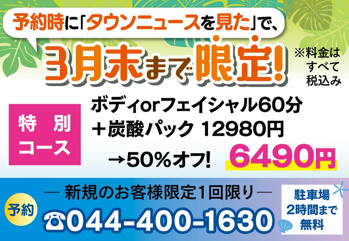 3月末まで予約時に本紙を見たと伝えると、特別コースのオプションの炭酸パック4400円が無料に。入学式や卒業式に合わせて調子を整えたい人にもピッタリ。