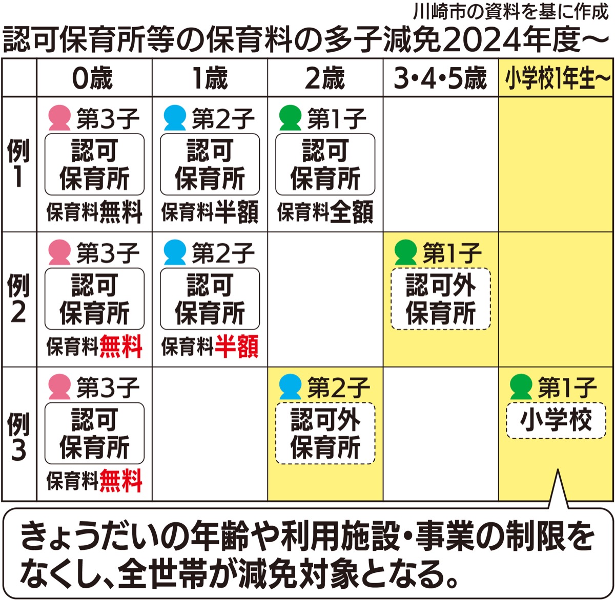 川崎市は4月から多子世帯支援として、保育料のきょうだい減免を全世帯に拡大する。きょうだいが同一園に入所できるよう利用調整基準も変更。第3子以降の経済支援策はこのほど、国でも決定されたが、市独自の少子化対策の一手として進めていく考え。