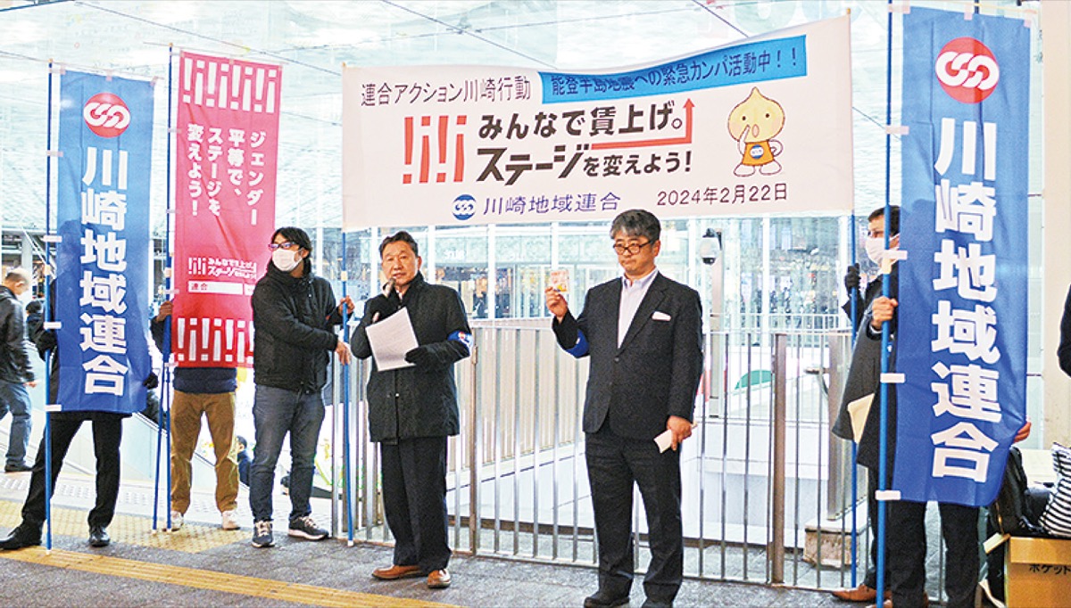 県内最大の労働団体「連合神奈川」の2024春季生活闘争「連合アクション」にあわせ、川崎地域連合は2月22日、JR川崎駅東口と溝口駅キラリデッキで街頭運動を実施した。