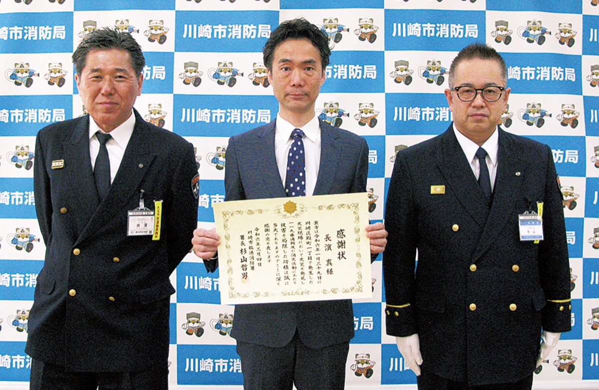 火災被害を最小限に抑えたことをたたえ、臨港消防署(杉山哲男署長/川崎区池上新町)は3月4日、長濱真さん(50)=川崎区殿町=に感謝状を贈った。