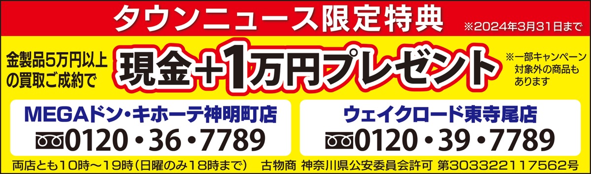 国道1号線沿いの買取専門店「おたからやMEGAドン・キホーテ神明町店」では、3月末まで金製品の買取を強化している。買取成約金額が5万円を超えた場合、買取金額に上乗せして現金1万円をプレゼント。スタッフは「まだまだ金の高値が続いています。自宅に金製品があれば、査定だけでもしてみませんか」と話す。