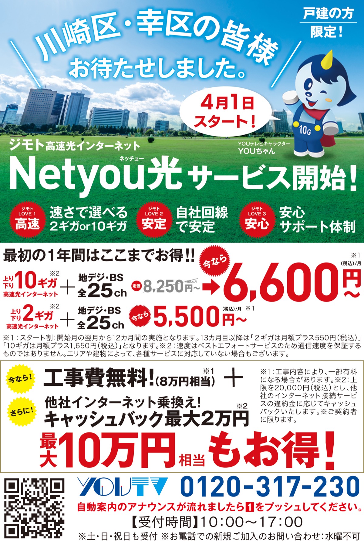 地域密着のケーブルテレビ局「YOUテレビ」が手掛ける高速光インターネット回線「Netyou光」のエリアが鶴見区、神奈川区などに加え、川崎区・幸区にまで広がった(戸建限定)。