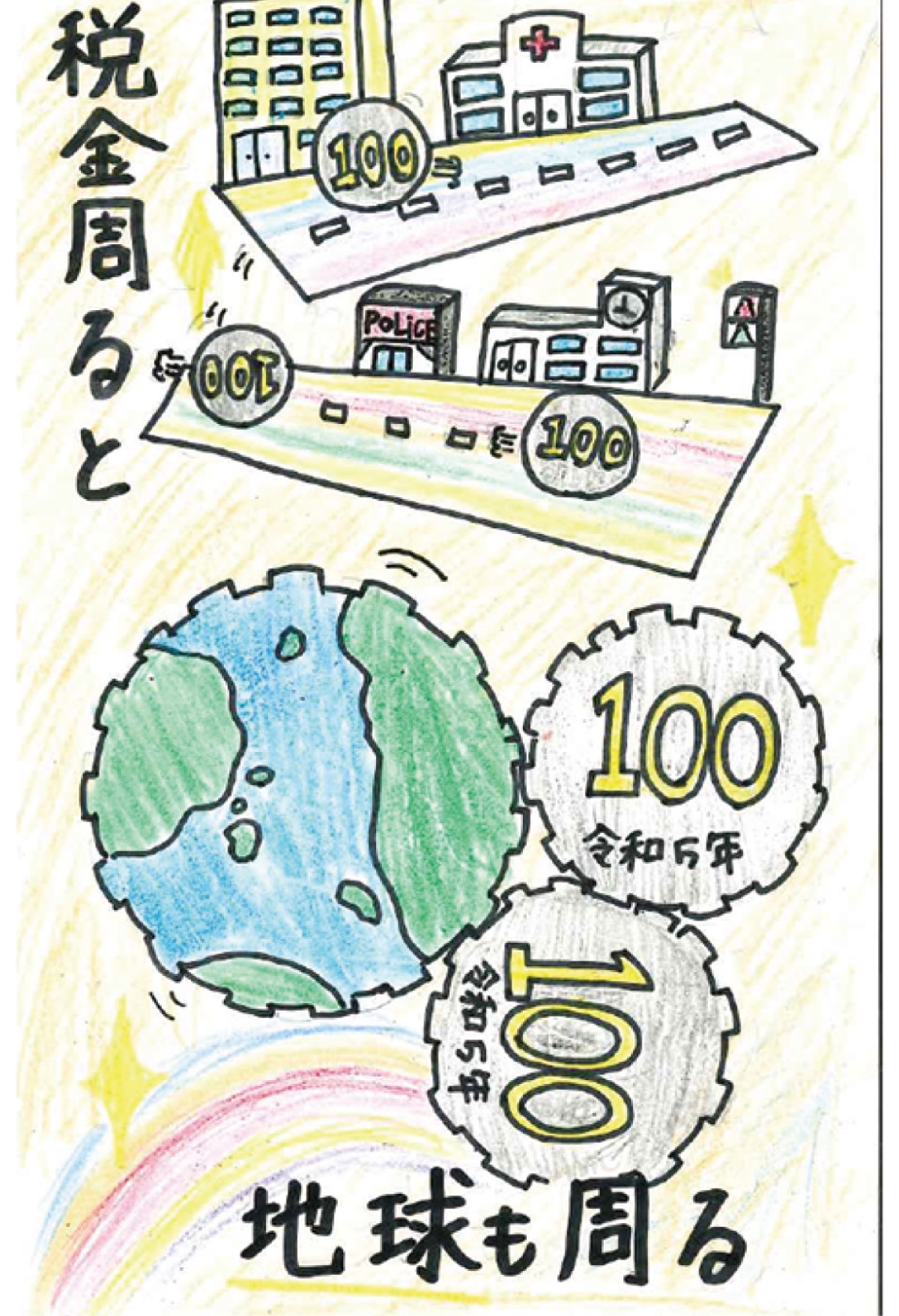 税に関する絵はがきコンクールで川崎南法人会会長賞に選ばれた飯田梓さん(古市場小6年)の作品は、100円硬貨で表した税金が病院や警察に届いている様子と、硬貨と地球が歯車となって動いている姿を描き。「税金周ると地球も周る」と言葉を添えた。飯田さんは「絵を描くことが好きで、賞を受賞できてうれしい。学んだ税のことをハガキを通して形に残せて良かった」と喜びを語った。