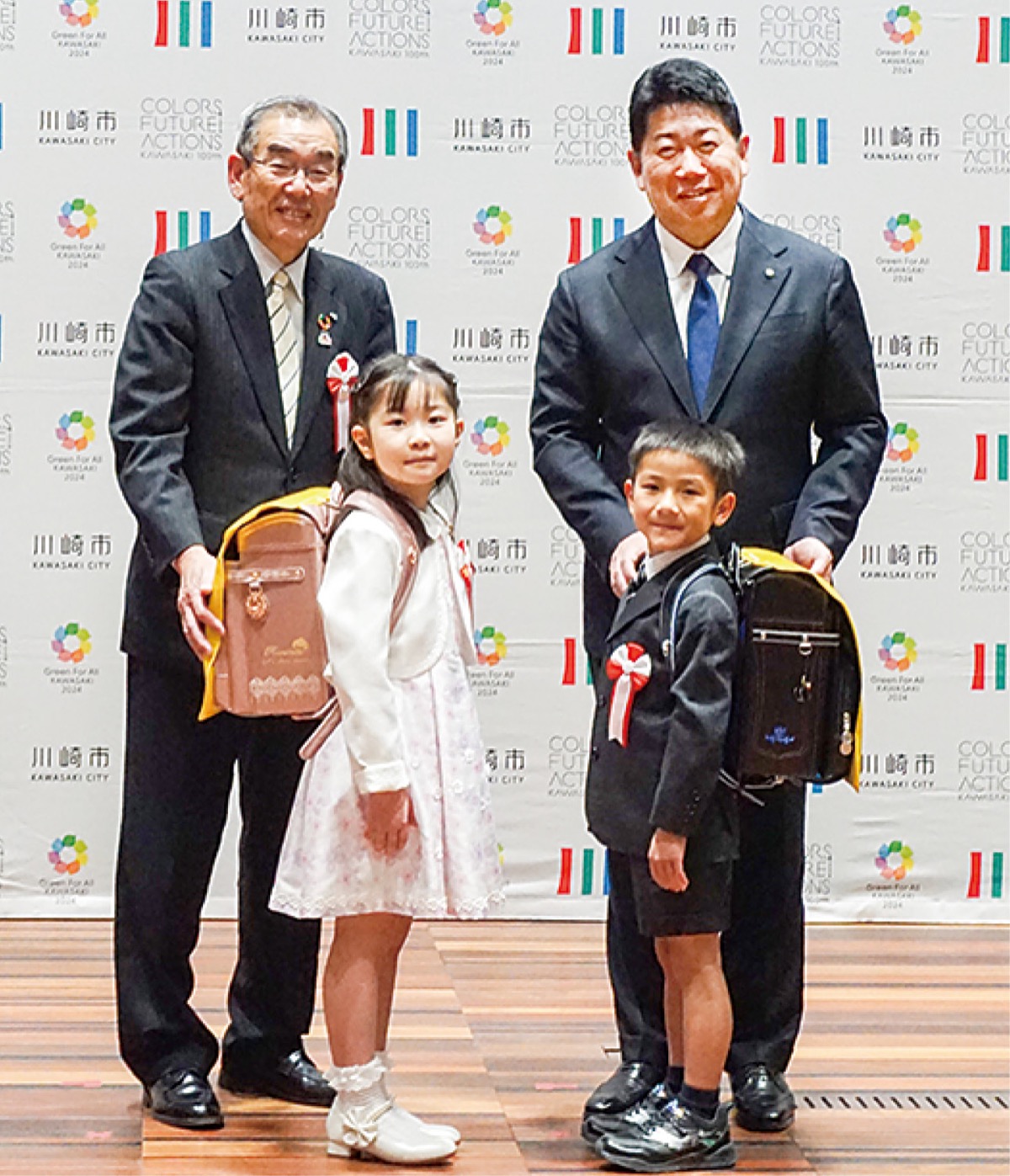 贈呈式には福田紀彦市長とJAセレサ川崎の梶稔代表理事組合長のほか、各社の川崎支店・支社幹部が出席。新小学1年生を代表し、いずれも高津区在住の小田鷹宏さんと西久保沙羽さんが、福田市長や梶組合長からランドセルカバーやワッペンを手渡された。