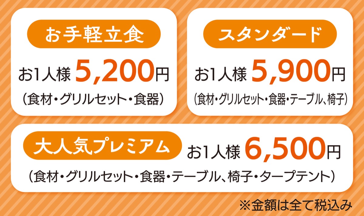 食材、BBQ器材がついたセットプラン(5200円〜)なら、セッティングや後片付けなど面倒なことは全てスタッフが行ってくれるので、思いっきり楽しむだけ。