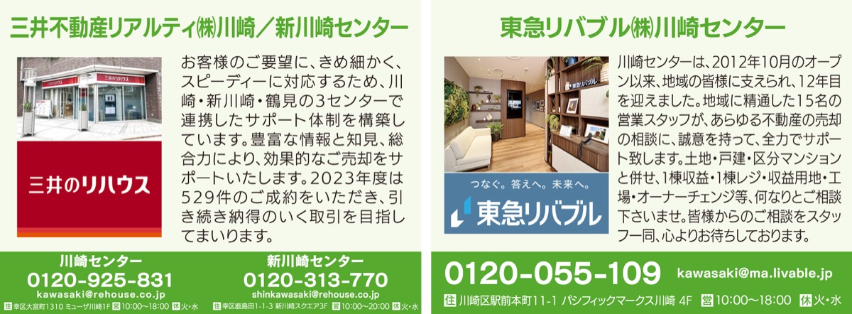 本紙では春の特別企画として、不動産大手の2社(東急リバブル川崎センター、三井のリハウス川崎/新川崎センター)と協力し不動産を無料査定。本紙が取り次ぎ2社一括で依頼することで、自宅の資産価値を比較でき、各社の視点を踏まえ今後の住まいや不動産全般の相談も可能。まずは当編集室へお問合せを(左記)。