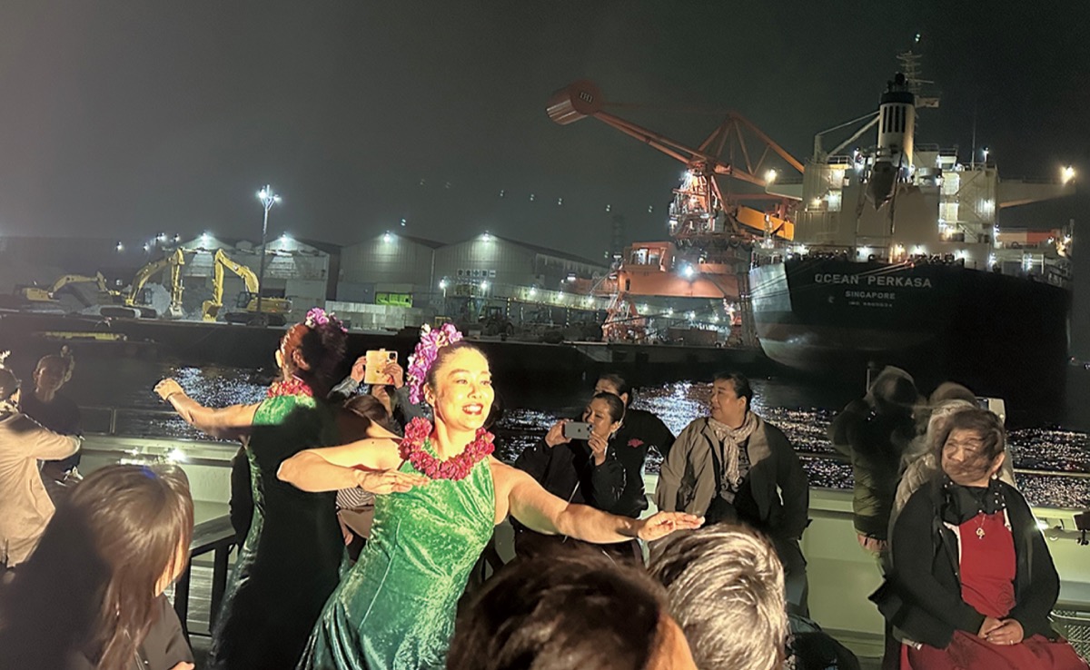 川崎工場夜景の人気スポットをクルーズ船で周遊し、ハワイアンミュージックとフラのステージを楽しむ初の企画。午後4時半出航のサンセットクルーズと7時出航の工場夜景クルーズの2回行われ、約200人が参加した。