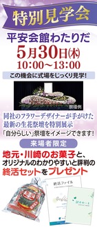 「地域に寄り添い「安心」と信頼」を届けるセレモニアグループの『平安会館わたりだ』では5月30日(木)、特別見学会を開催。午前10時から午後1時。予約不要。