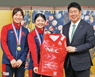 女子バレーボールのⅤリーグ・ディビジョン1に所属するNECレッドロケッツの中西了将(りょうすけ)GM、金子隆行監督、柳田光綺(みずき)選手、藤井莉子選手が5月7日、川崎市役所を訪れ、福田紀彦市長に2023-24シーズンのリーグ優勝を報告した。