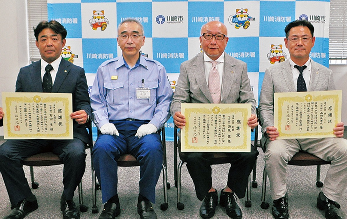 川崎区に事業所を構える3社が川崎消防署(小川晶署長)に署内で使用する備品を寄贈したとして、感謝状が贈られた。