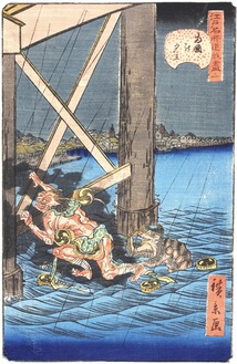今回のメインビジュアルにも使われている「江戸名所道戯尽 二 両国の夕立」は、両国橋の下を流れる隅田川に天から落ちてしまった雷様の尻子玉を狙う河童の様子を描いた作品。雷様は屁を放ち、河童は鼻をつまんでいる。これは大津絵の画題「雷公の太鼓釣り」を元にしており、太鼓を落とした雷様が黒雲から乗り出してその太鼓を釣ろうとしている図柄。「熟練した者でも時には失敗することがある」という例えになっている。