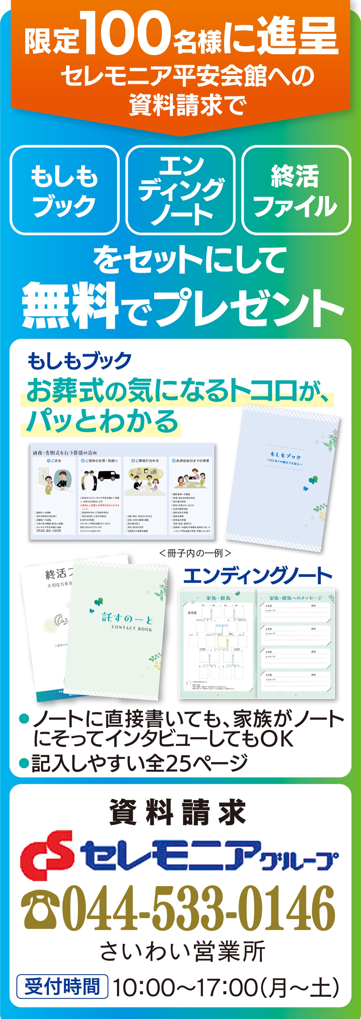 もしも急に喪主を担うことになったら--。一体何から手をつければいいのか、ピンとくる人は少ないだろう。川崎全区に式場「平安会館」を展開するセレモニアグループは、葬儀の疑問や悩みを解決するオリジナルの保存用冊子を作成した。