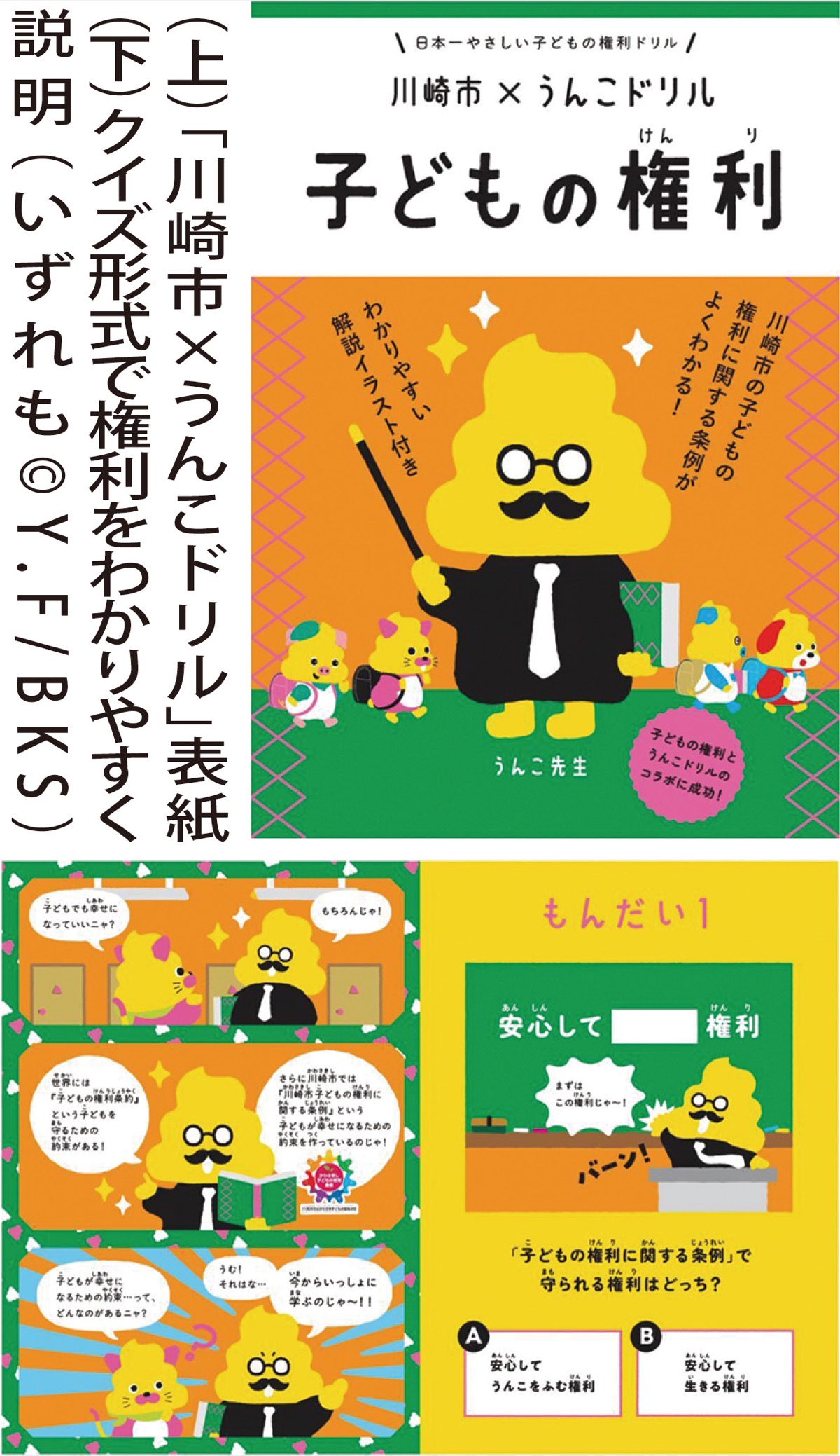 子どもたちに大人気の「うんこドリル」の川崎特別版となる『川崎市×うんこドリル 子どもの権利』が完成した。市制100周年を記念し、川崎市が全国で初めて条例化した「子どもの権利」について、おなじみの「うんこ先生」が解説している。市はこのドリルを使ったワークショップのマニュアルも作成し、ドリルとセットでの活用を呼び掛けている。