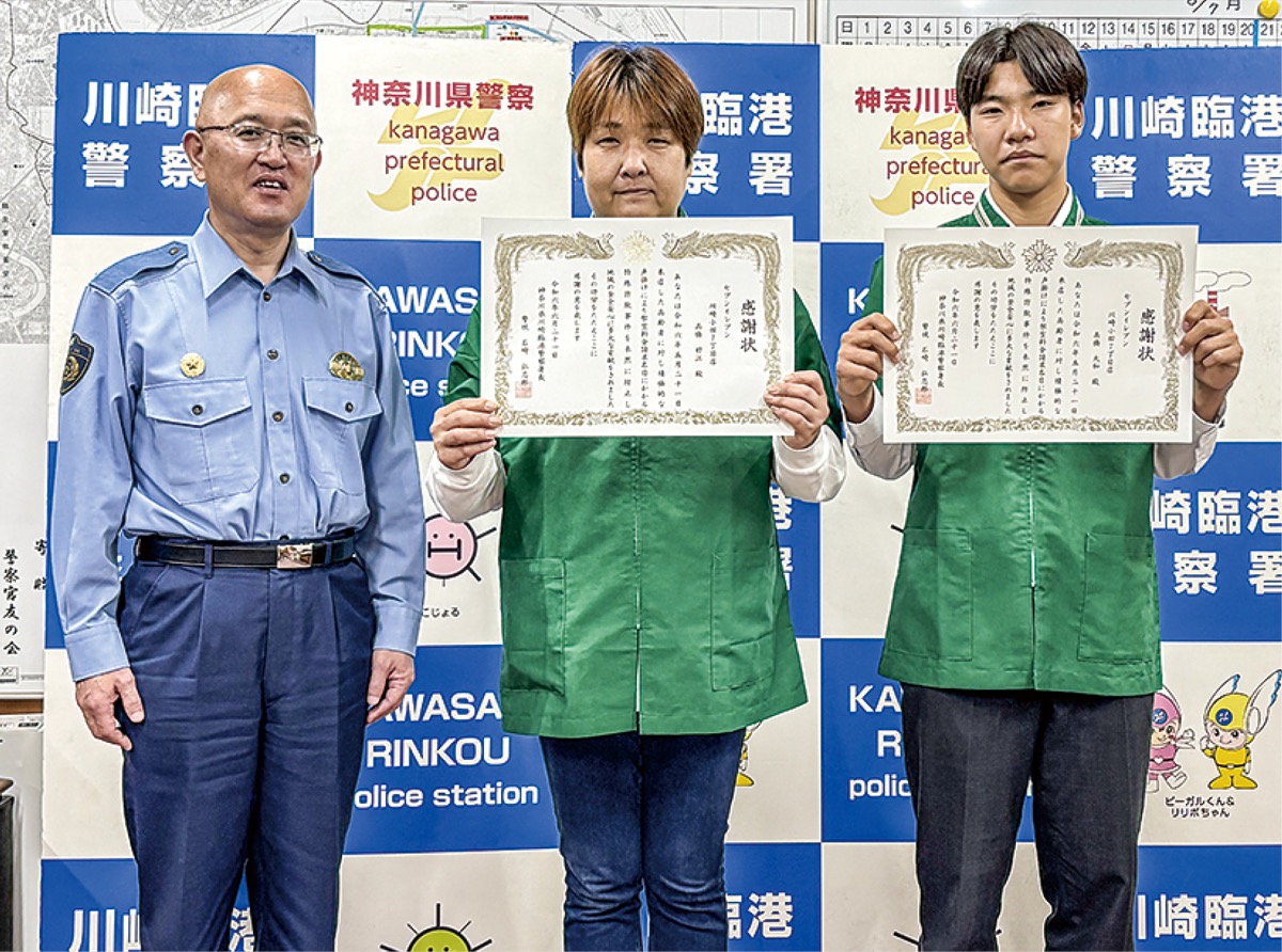 特殊詐欺被害を未然に防いだとして、セブン-イレブン川崎小田7丁目店のアルバイト従業員、高橋好江さん(47)と大和さん(15)親子が6月21日、川崎臨港警察署(川崎区池上新町/石崎弘志郎署長)から感謝状が贈られた。