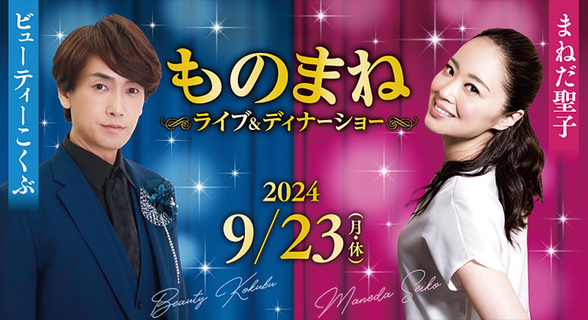 ものまね王座決定戦で3度優勝した「ビューティーこくぶ」と、永遠のアイドル松田聖子をトリビュートする「まねだ聖子」によるライブショー。同ホテルのシェフが腕を振るう自慢の料理とともに楽しめる。