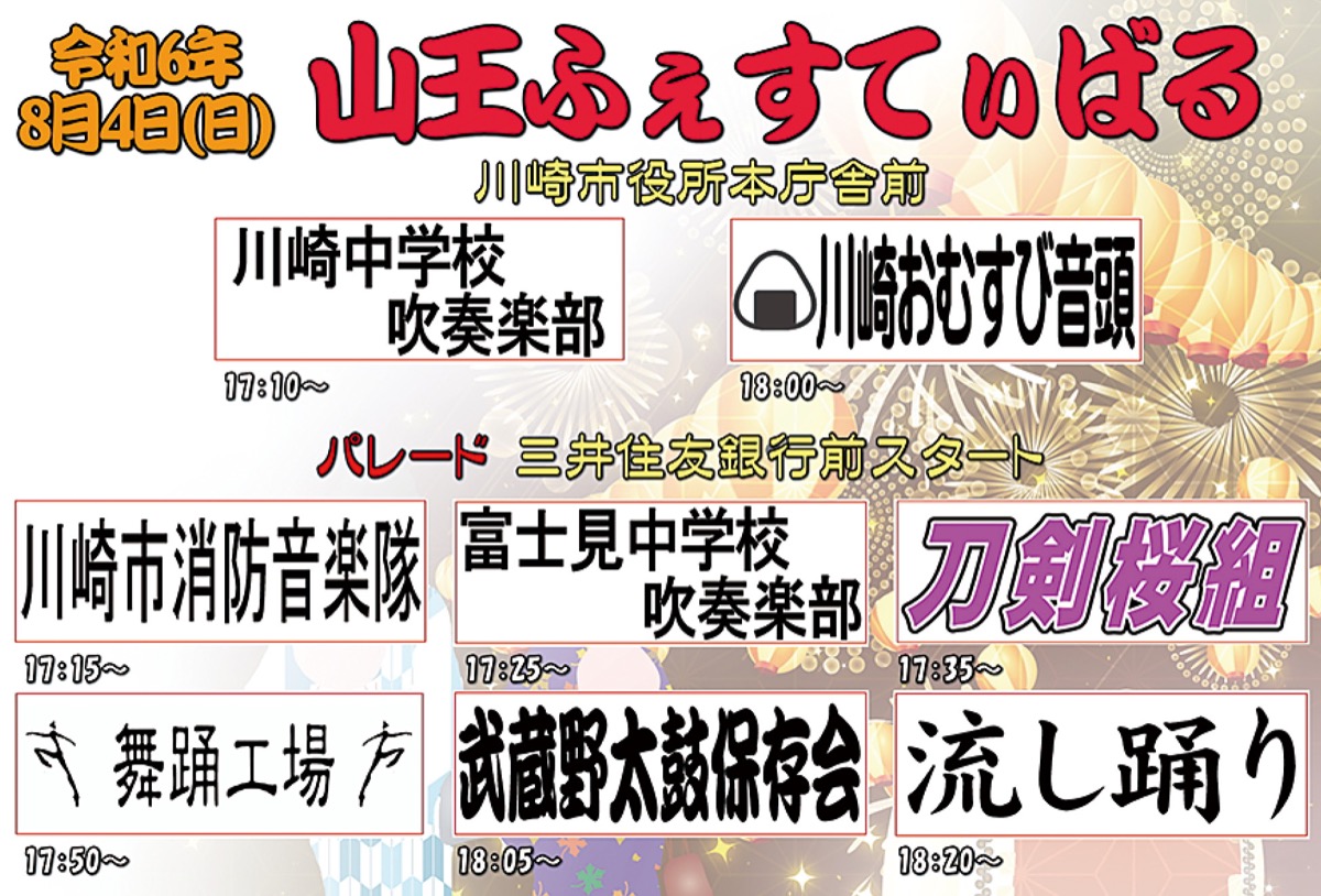 同ふぇすてぃばるは地元町内会や商店街、団体などでつくる実行委員会が主催する。イベントは富士見中学校と川崎中学校の生徒による参加団体紹介を皮切りにスタート。川崎中学校吹奏楽部、川崎市消防音楽隊、富士見中学校吹奏楽部が行進しながら演奏を行う。「刀剣桜組」「舞踊工場」の演舞が行われ、川崎おむすび音頭武蔵野太鼓の演奏、流し踊りが披露される。同実行委員会広報の小林一三さんは「本庁舎からのライトアップされた宮神輿二基など見ごたえのある3時間。楽しんでもらえれば」と来場を呼びかける。