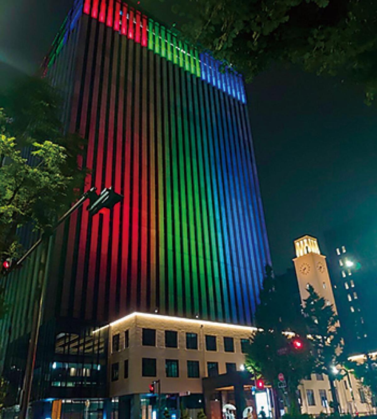祭りに彩りを添えようと、川崎市役所川崎山王祭の期間中(8月4日まで)に本庁舎を赤、緑、青のブランドメッセージ色にライトアップ=写真=する。点灯時間は午後6時から10時まで。