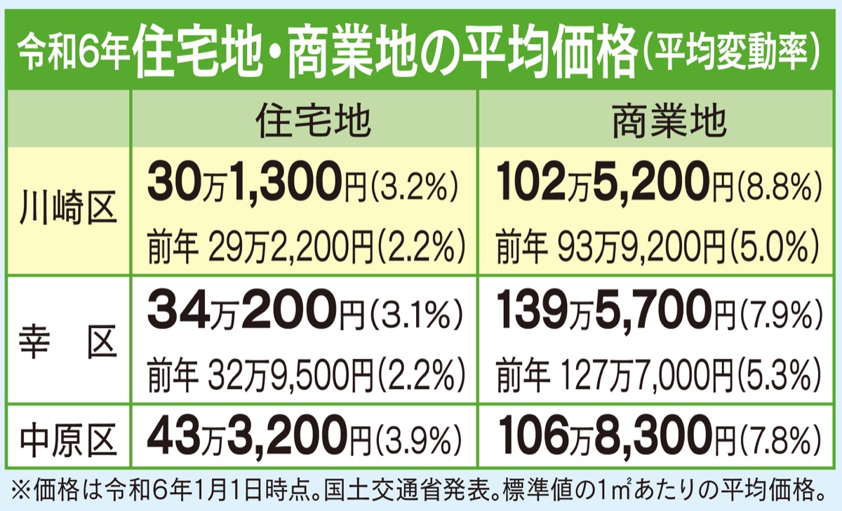 国交省が今年3月に公表した令和6年の公示地価では、都心に近い川崎市の住宅地は全ての区で上昇し、価格変動率は3・2%と上昇率が拡大。川崎区は3・2%、幸区は3・1%だった。交通利便性が高い住宅地を中心に需要が堅調で、駅周辺の価格上昇の波及や住環境の需要の多様化等により、前年横ばいだった地点でも上昇が見られた。商業地の変動率は川崎区が8・8%、幸区が7・9%と大幅増。