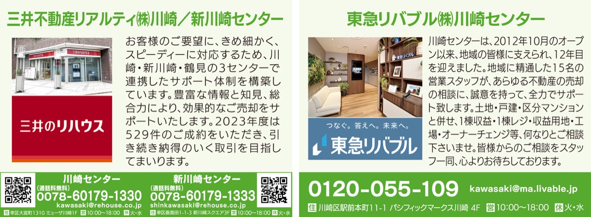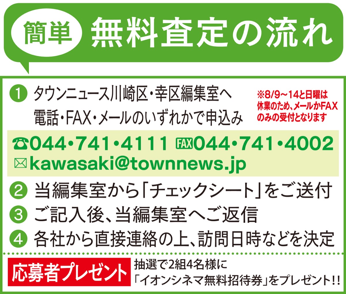 本紙では夏の特別企画として、不動産大手の2社(東急リバブル川崎センター、三井のリハウス川崎/新川崎センター)と協力し不動産を無料査定。本紙が取り次ぎ2社一括で依頼することで、自宅の資産価値を比較でき、各社の視点を踏まえ今後の住まいや不動産全般の相談も可能。まずは当編集室へお問合せを(左記)。