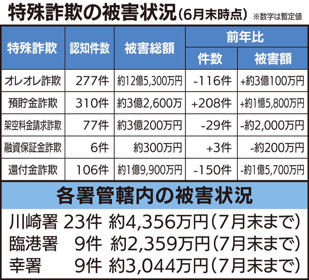 言葉巧みにだまして金品を奪う「オレオレ詐欺」や「還付金詐欺」などの特殊詐欺被害。神奈川県内の6月末時点の被害件数は834件で昨年比マイナス171件だが、被害金額は約21億7700万円で前年比増と被害は後を絶たない。