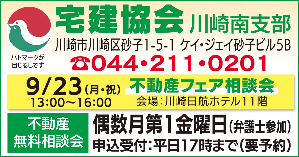 神奈川県宅地建物取引業協会川崎南支部は、住まいに関する問題や空き家に関する事など不動産取引について、偶数月第1金曜日に無料での相談会を行っている。午後1時から3時まで(予約制)。