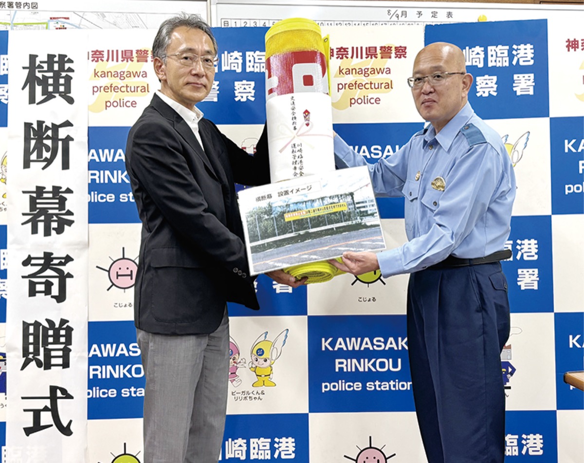 「交通事故を防ぐ一助になれば」と川崎臨港交通安全運転管理者会が川崎臨港警察署に寄贈。同会は安全運転管理者を置く事業者でつくる任意団体で交通安全活動を行う。184事業者(8月28日時点)が会員。