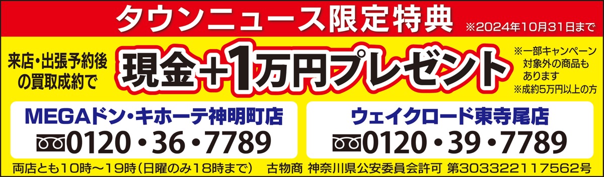 国道1号線沿いの「MEGAドン・キホーテ神明町店」内にある買取専門店「おたからや」は、腕時計・ロレックスと金製品の買取を強化中。店頭・出張問わず、予約後の買取成約で買取金額にプラスして現金1万円を進呈している。期間は10月末まで。