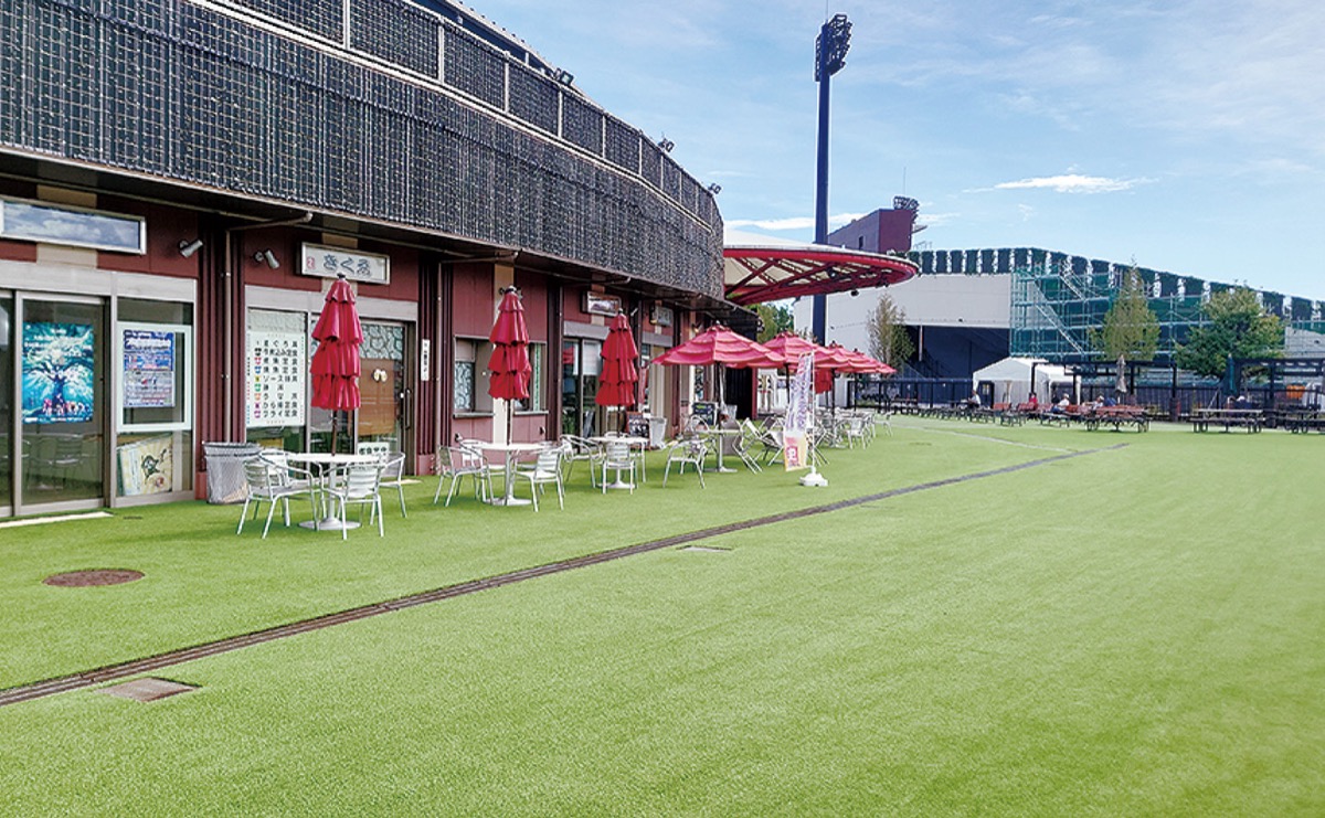 西ステージ前に敷かれていた人工芝も786平方メートル拡張。今まで以上に多くのイベントが楽しめるようになった。