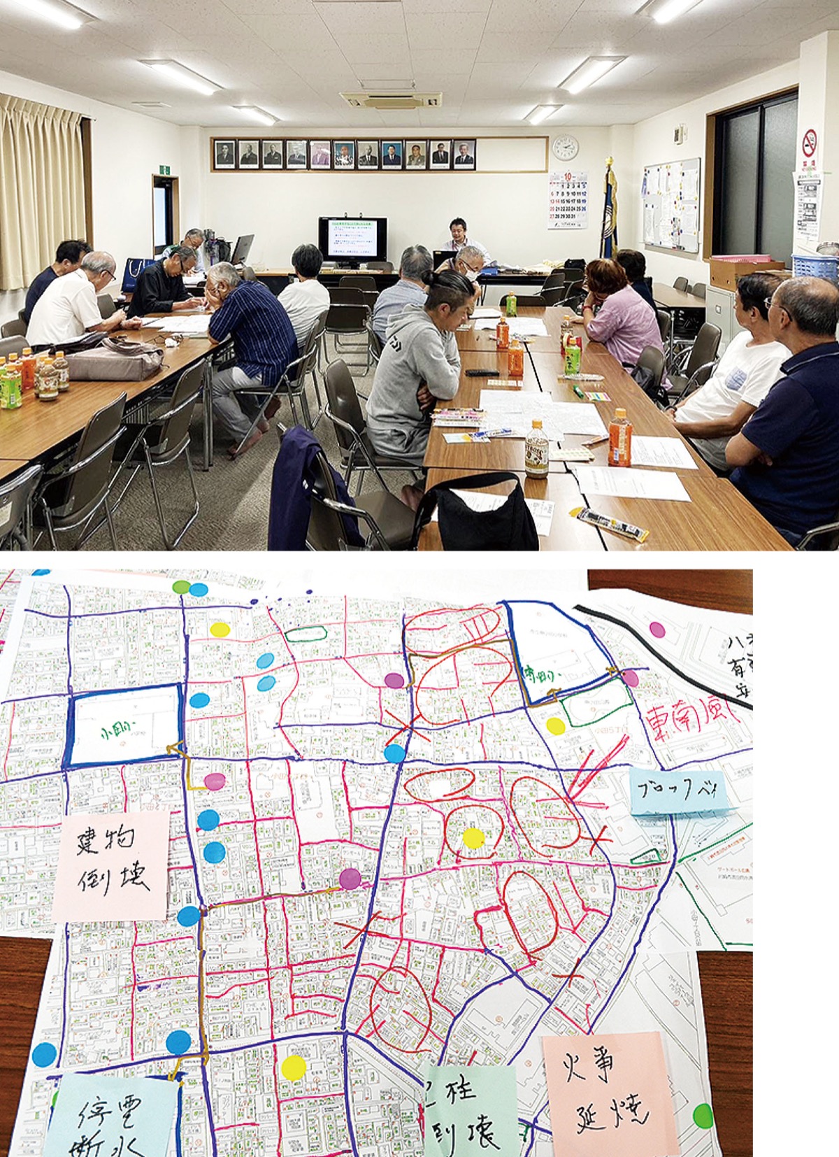 防災士の資格を持つ防災担当部長の蔵光裕さん=人物風土記で紹介=により初実施された。訓練では冬の寒い夕方、最大震度6強の地震が発生したことを想定。町内の地図に避難経路を書き込んだり、建物倒壊や火事延焼など起こりうることを付箋で貼り付けたりして、災害時の避難経路などについて話し合った。