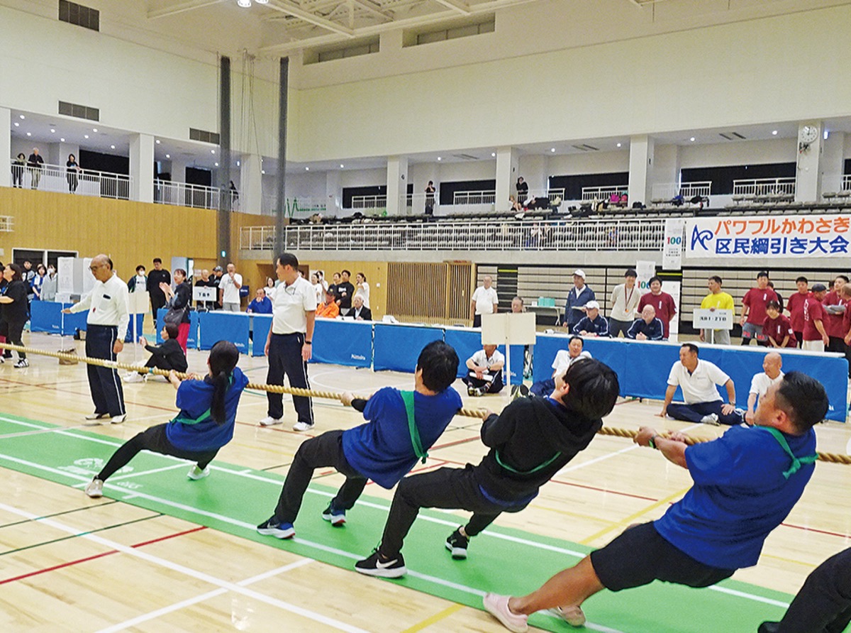 パワフルかわさき区民綱引き大会が11月3日、カルッツかわさき大体育館で行われた。今年は市制100周年を祝し、通常の3部門に加えて、小学生以上の4人の選手の年齢(1の位を四捨五入)の合計が100になるチームで争う「市制100周年記念の部」を特別開催。同部門にはMOJAさんを司会に迎え、人気キャラクター・チョリ山チョリ男も応援に駆け、熱い戦いが繰り広げられた。