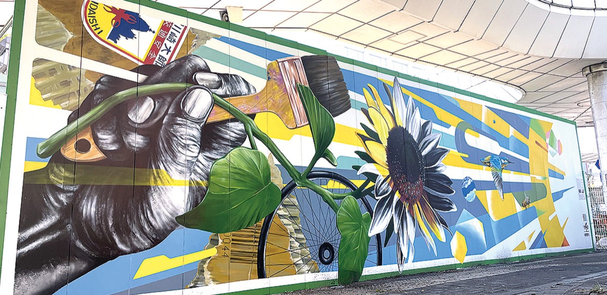 川崎区のハローブリッジ下の倉庫壁面が、市内在住アーティスト・YUSEIさんとunomoriさんの合作によるミューラルアート(壁画)で彩られ、行き交う人々の目を楽しませている。