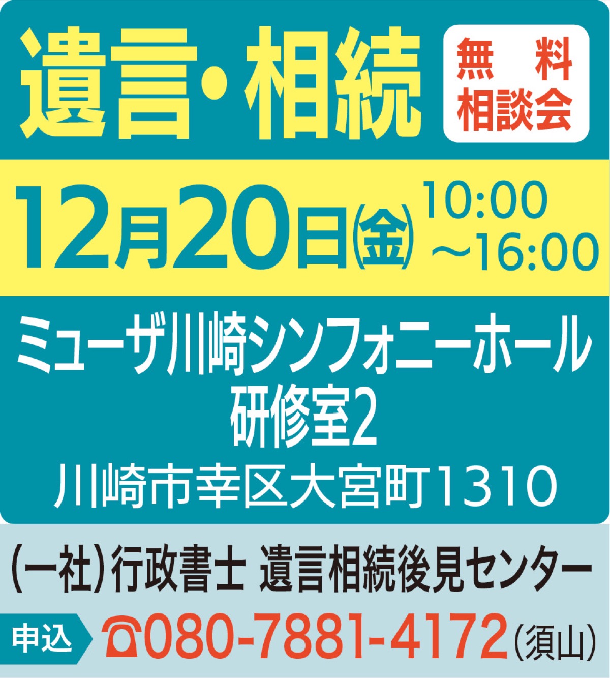 (一社)行政書士遺言相続後見センターが12月20日(金)、午前10時から午後4時、ミューザ川崎シンフォニーホール研修室2で第35回無料相談会(幸区大宮町)を開催する。予約優先、当日参加可。