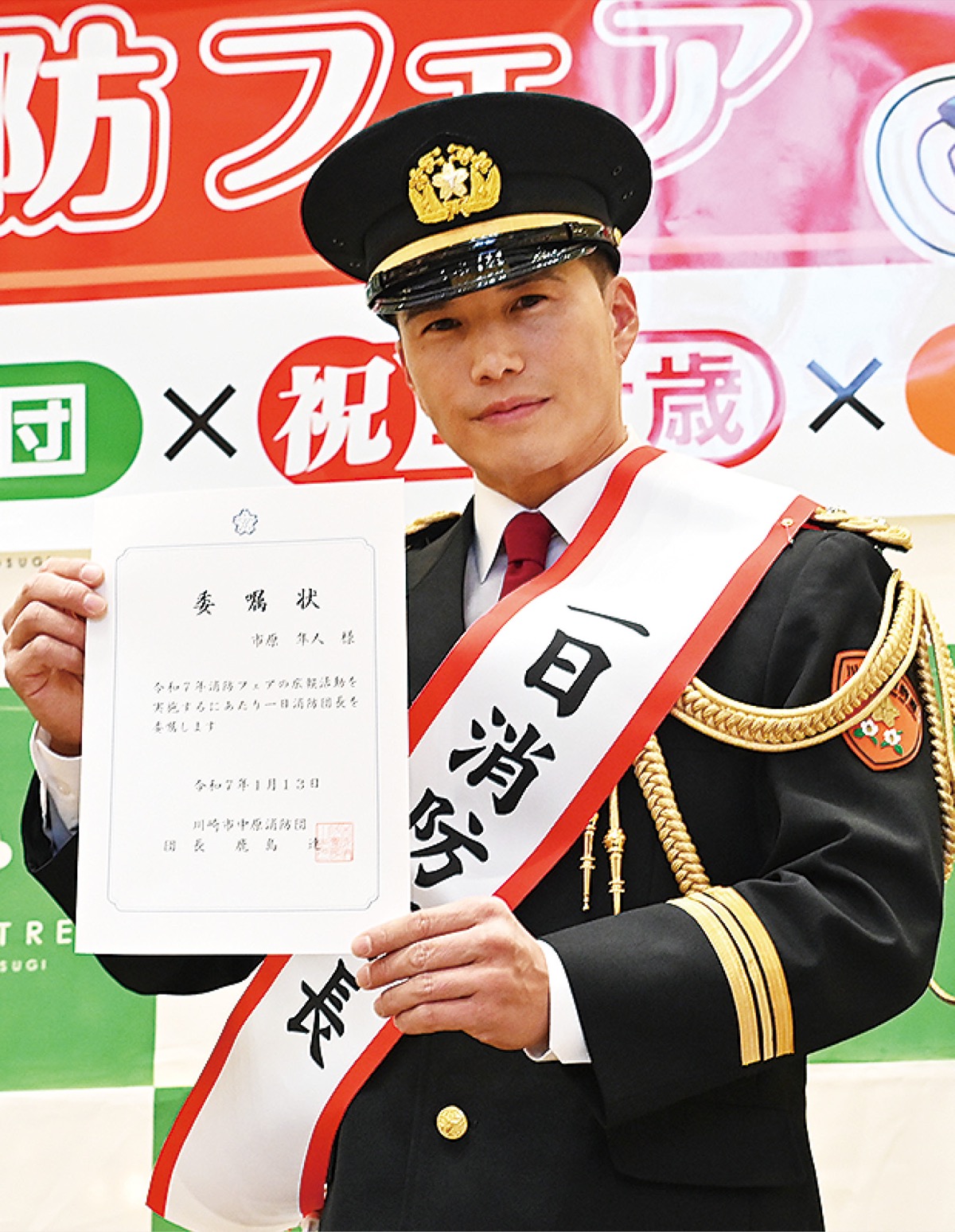 川崎市消防局の「消防フェア」が1月13日、グランツリー武蔵小杉(中原区)で開催された。川崎市出身の俳優・市原隼人さんが一日消防団長に就任し、来場者に消防団のPRと火災予防を呼び掛けた。