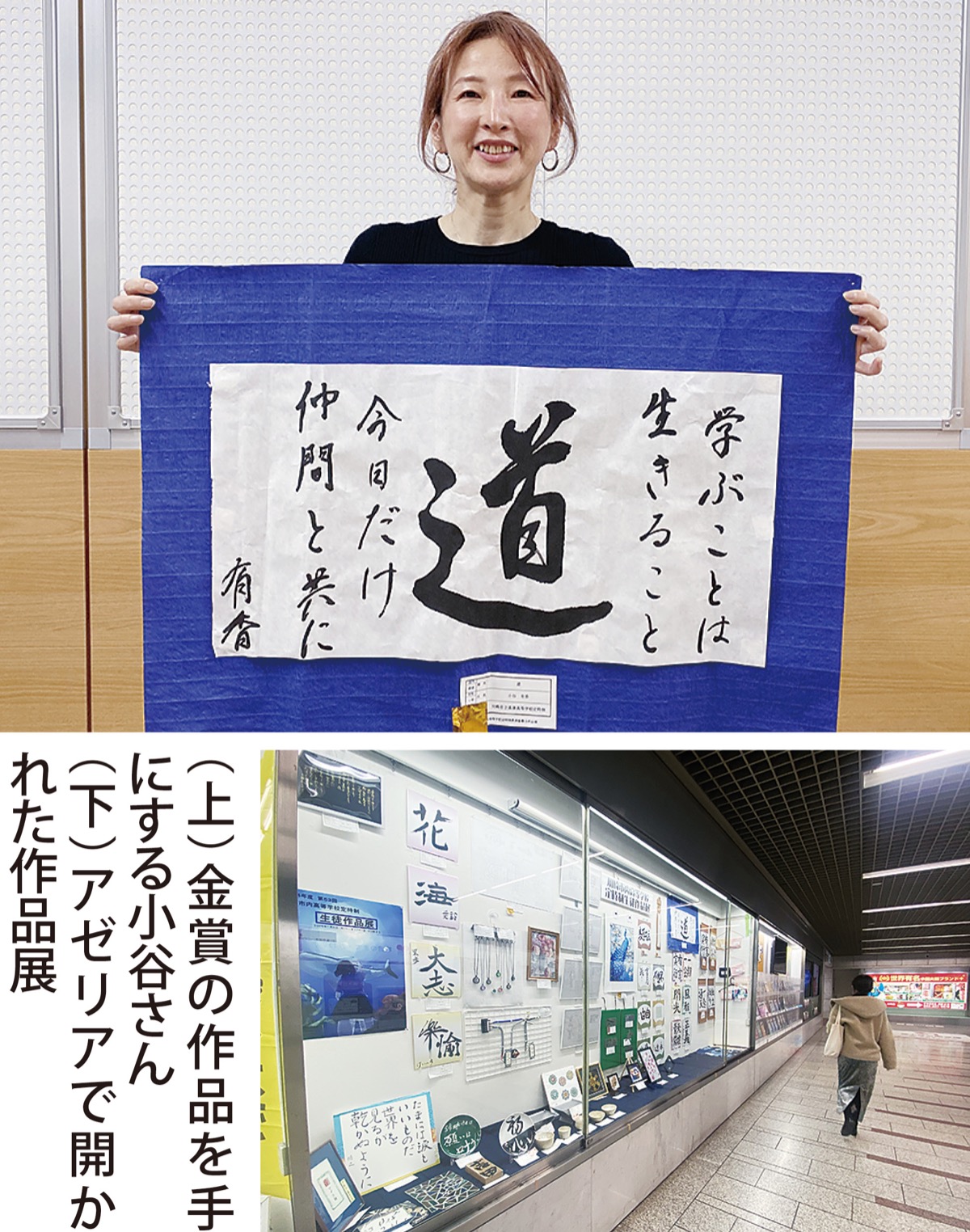 このうち書道部門で「最優秀賞」に選ばれた高津高校定時制1年生の小谷有香さん(多摩区在住)は、紙の真ん中に堂々とした行書で「道」と書き、両脇に「学ぶことは 生きること 今日だけ 仲間と共に」と、今の自分の思いをしたためた。