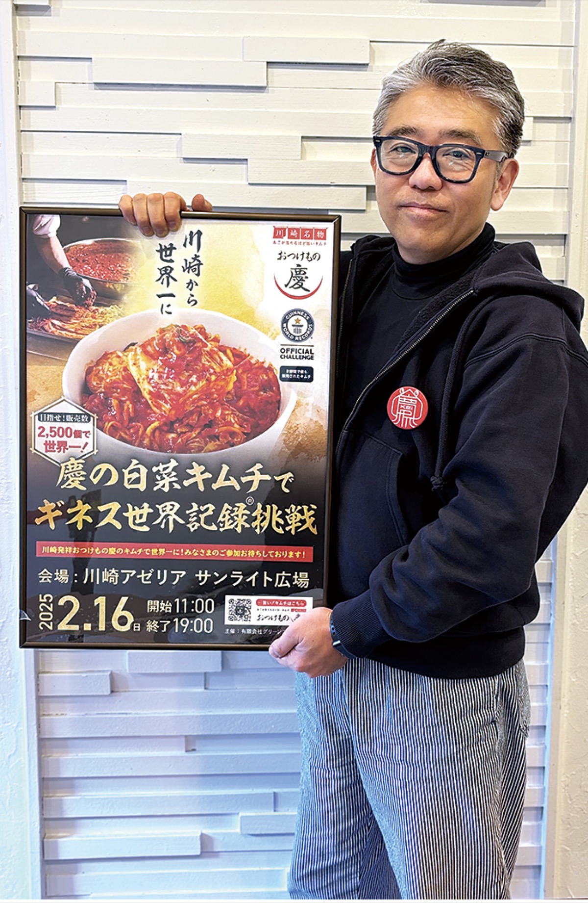 川崎のキムチ専門店「おつけもの慶」が2月16日(日)、ギネス世界記録に挑戦する。8時間で2500個の白菜キムチの販売を達成すると「最も売れたキムチ」として記録が認定される。同店を運営するグリーンフーズあつみ代表取締役社長の渥美和幸さんは「多くの人とつながり、盛り上がる特別な一日。一緒にギネス記録達成を喜びたい」と語る。