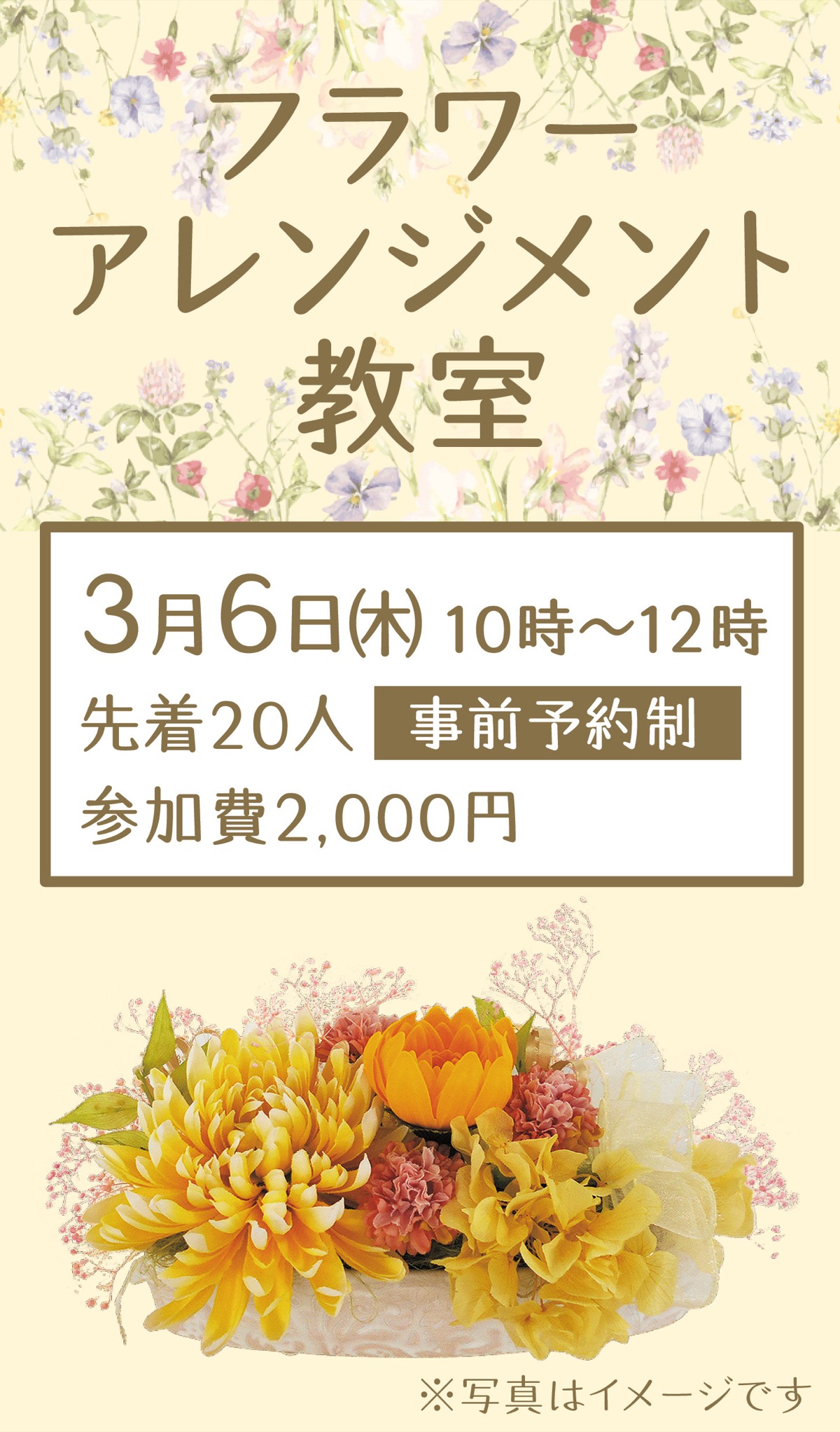 地域貢献事業の取り組みとして、さまざまな地域イベントを開催している斎場「平安会館わたりだ」で、3月6日(木)に「フラワーアレンジメント教室」が開かれる。