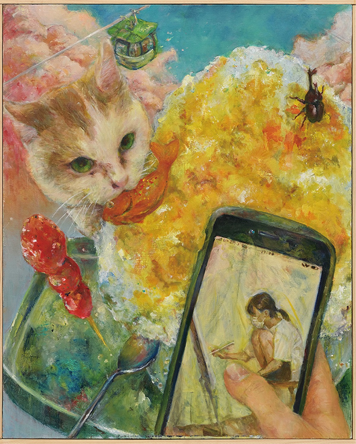 笠原さんは、『私』の作品で受賞。生田にある絵画教室に通う笠原さんは、約1年かけて制作。今まで飼っていた猫や金魚など、好きなものを作品内に詰め込んだ。笠原さんは「今まで出合ってきたものを自由に、自然に描いた作品」と話す。